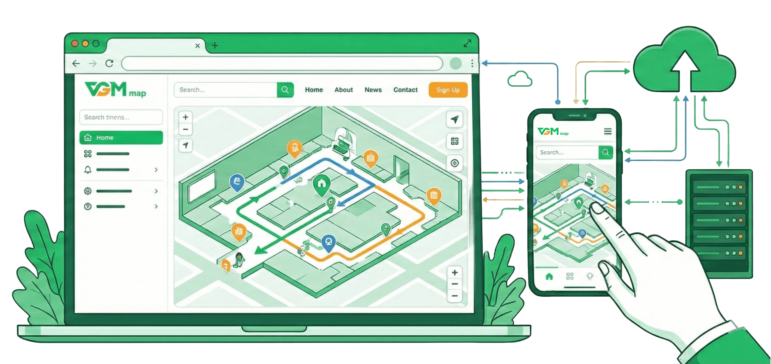 - Biến website hoặc app hiện tại thành bản đồ tương tác thông minh, giúp khách hàng tự tìm kiếm, định vị, điều hướng dễ dàng.