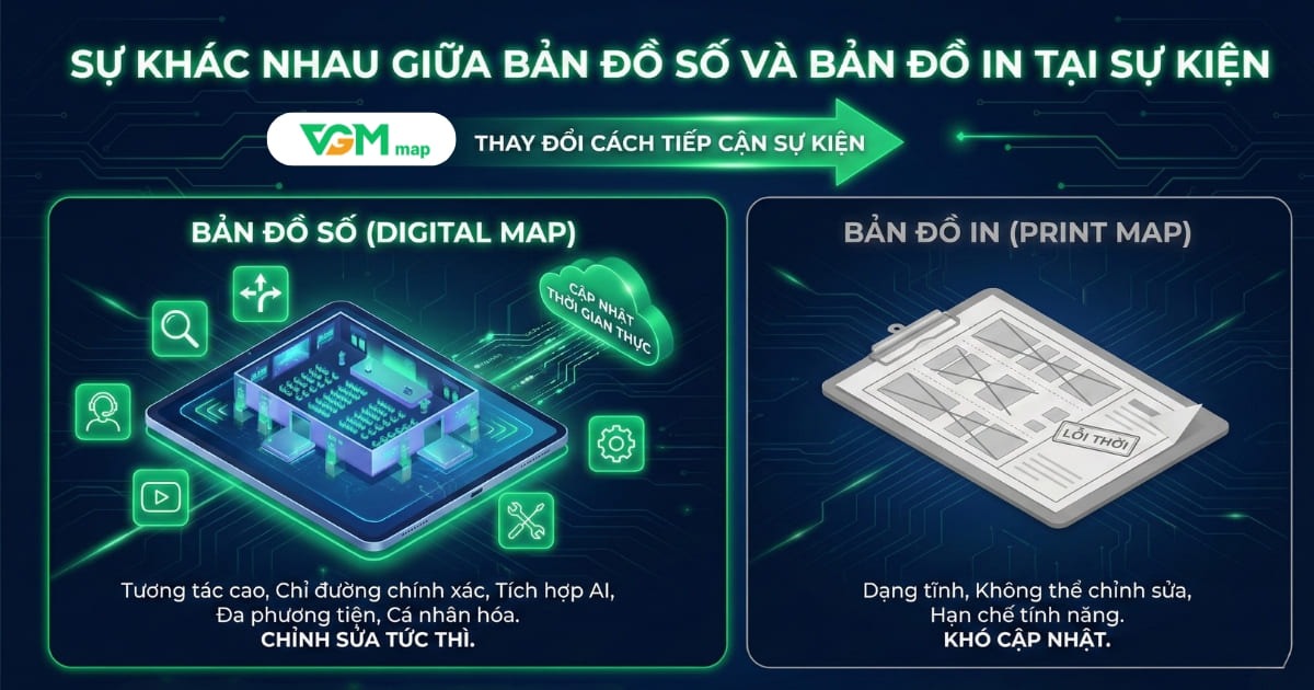 Bản đồ số cho sự kiện mang tính tương tác cao, có thể cập nhật theo thời gian thực và hỗ trợ chỉ đường chính xác. Trong khi đó, bản đồ in là dạng tĩnh, không thể chỉnh sửa và rất hạn chế về tính năng.