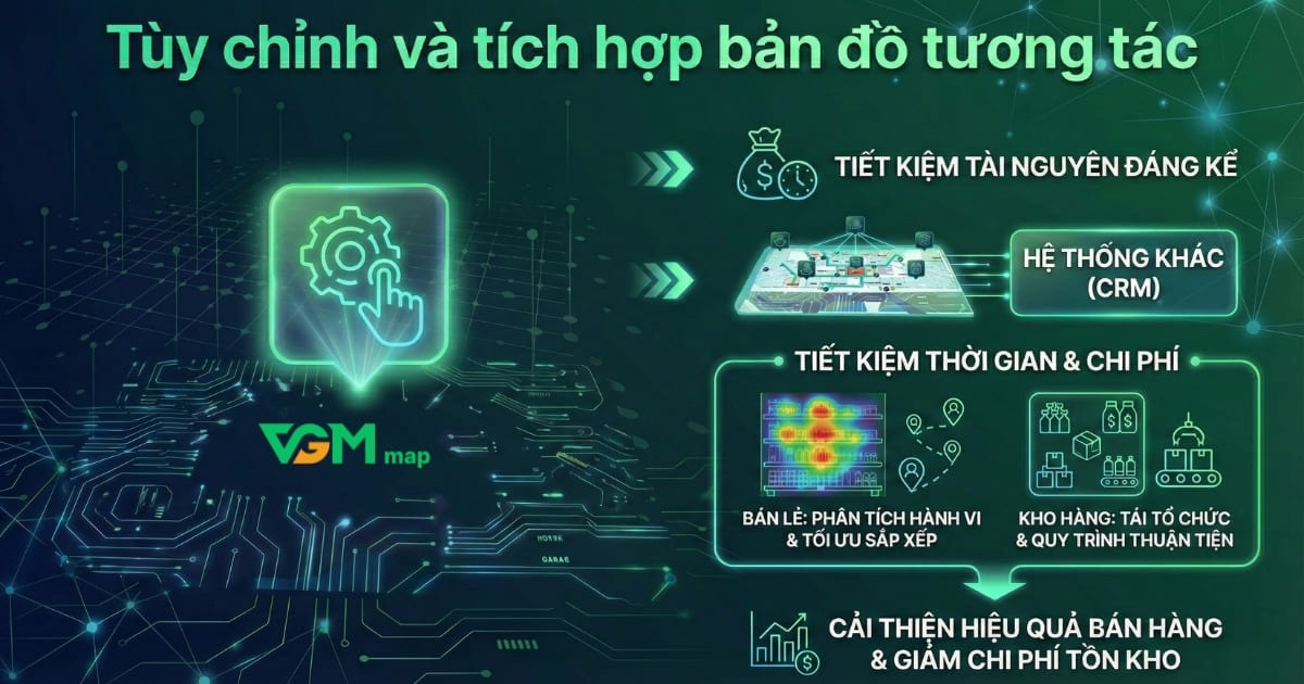 Nếu tích hợp bản đồ tương tác với các hệ thống khác chẳng hạn như CRM, giúp tiết kiệm cả thời gian lẫn chi phí. Ví dụ, trong ngành bán lẻ, doanh nghiệp có thể phân tích hành vi mua sắm của khách hàng và tối ưu cách sắp xếp sản phẩm trong cửa hàng.