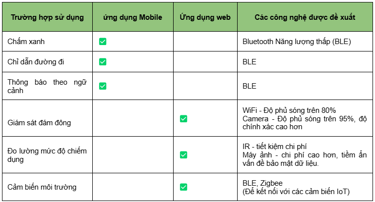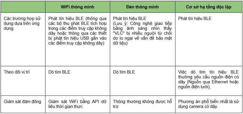 Điểm chung phổ biến nhất (hiện nay) là BLE, công nghệ này có thể hỗ trợ tất cả các trường hợp sử dụng dựa trên ứng dụng, đồng thời cho phép công nghệ định vị. Vì WiFi và BLE hoạt động ở cùng băng tần 2.4 GHz, nên việc kết hợp WiFi với BLE cũng là một cấu hình phổ biến, cho phép sử dụng các ứng dụng cũng như giám sát đám đông.