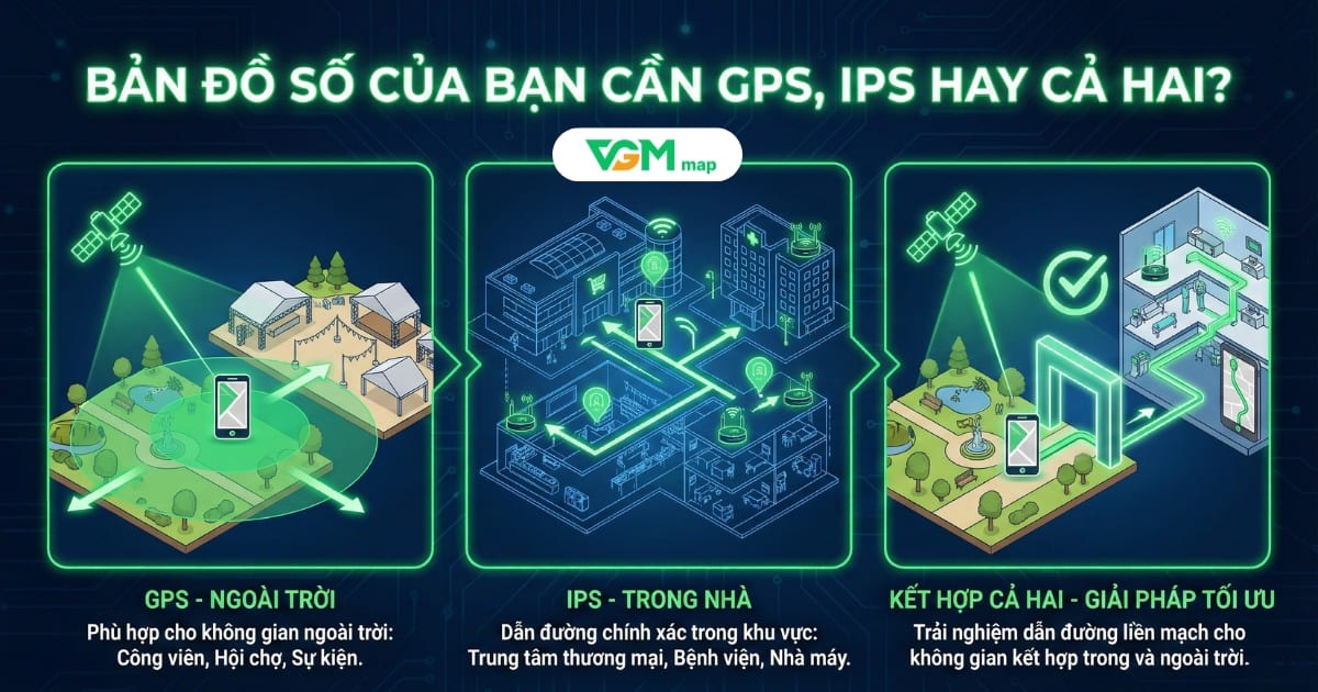 GPS phù hợp cho các không gian ngoài trời như công viên, hội chợ hoặc sự kiện ngoài trời. Trong khi đó, IPS (hệ thống định vị trong nhà) được thiết kế để dẫn đường chính xác bên trong các khu vực như trung tâm thương mại, bệnh viện hoặc nhà máy.