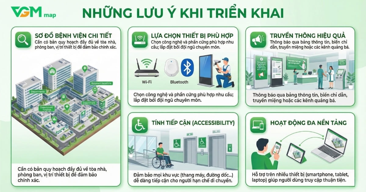 Để triển khai hiệu quả giải pháp dẫn đường trong – ngoài bệnh viện và hệ thống định vị số cho cơ sở y tế, các bệnh viện cần lưu ý những điểm sau: