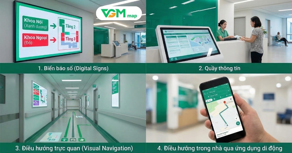 Các giải pháp dẫn đường trong nhà tích hợp trên ứng dụng di động đang trở nên phổ biến. Nhờ bản đồ số và chỉ đường tối ưu, người dùng có thể nhanh chóng tìm điểm đến bên trong hoặc xung quanh khuôn viên bệnh viện — tiện lợi, nhanh chóng và chính xác.