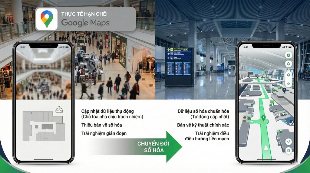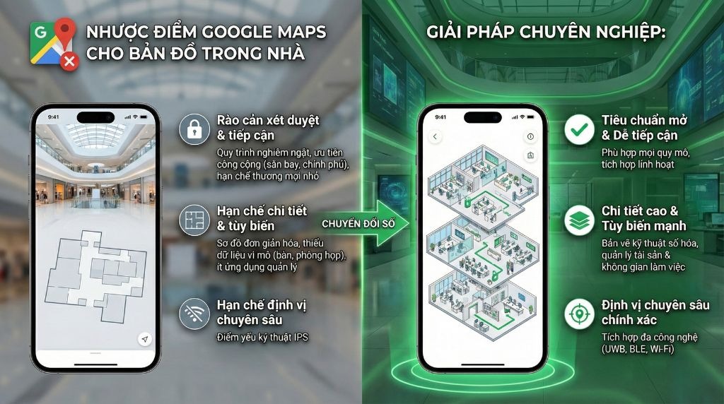 Tại sao Google Maps gặp khó khăn khi dẫn đường trong nhà? Tìm hiểu về rào cản xét duyệt, sai số định vị và giải pháp bản đồ số chuyên nghiệp dành cho doanh nghiệp.
