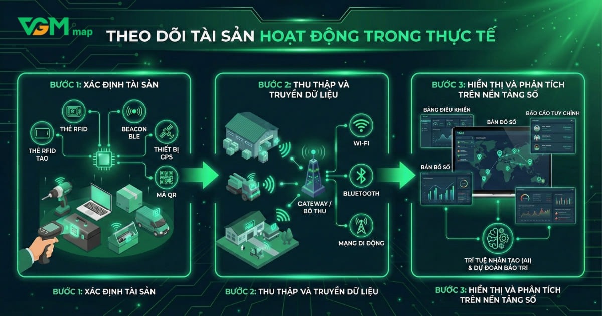 Theo dõi tài sản hoạt động dựa trên các cảm biến như thẻ RFID, beacon BLE hoặc thiết bị GPS, có nhiệm vụ gửi dữ liệu vị trí về hệ thống giám sát. Dữ liệu này được xử lý và hiển thị theo thời gian thực trên bản đồ số, cho biết tài sản đang ở đâu và được ai sử dụng. Trong thực tế, quy trình theo dõi tài sản gồm 3 bước chính: