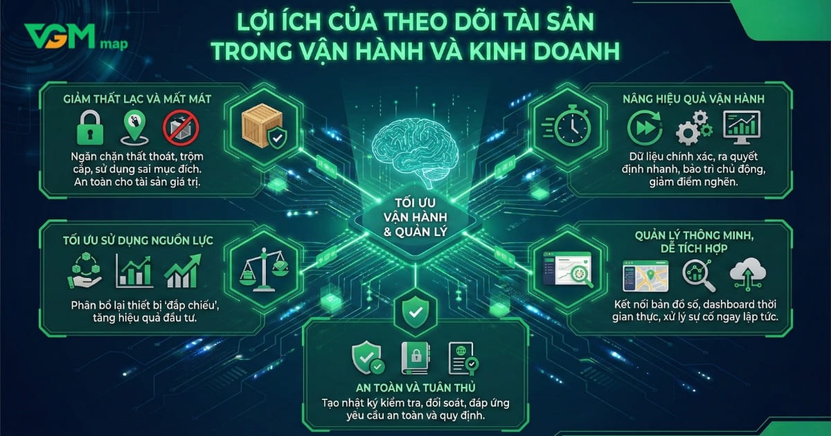 Theo dõi tài sản giúp tối ưu vận hành, giảm thất thoát, nâng năng suất và hỗ trợ ra quyết định dựa trên dữ liệu. Đồng thời, nó tăng mức độ an toàn và khả năng quản lý theo thời gian thực.