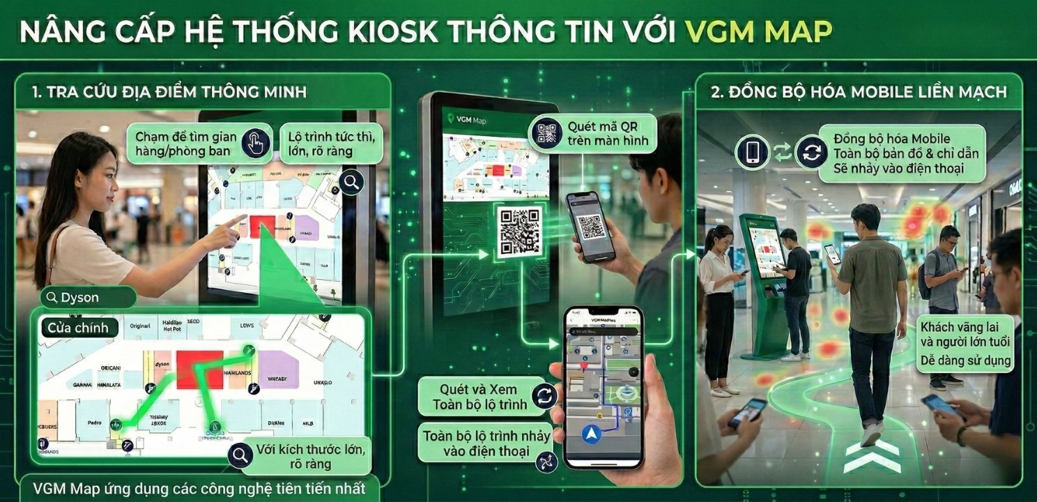 - Đồng bộ hóa Mobile: Đây là phần thú vị nhất. Sau khi tìm được đường trên Kiosk, khách chỉ cần quét mã QR trên màn hình đó. Toàn bộ bản đồ và chỉ dẫn sẽ nhảy vào điện thoại của khách để họ thực hiện các thao tác di chuyển tiếp theo. Cực kỳ liền mạch!