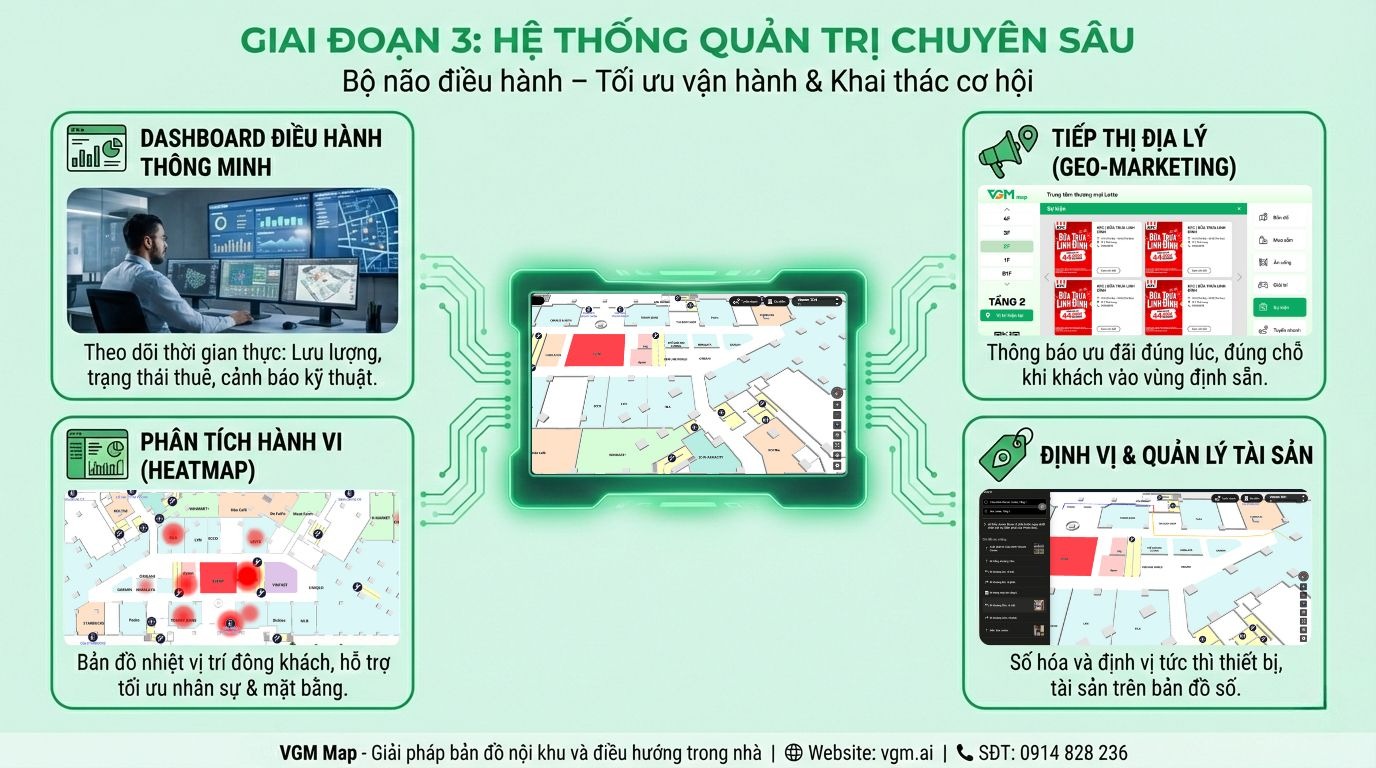 Giai đoạn 3 VGM Map sẽ tập trung vào việc xây dựng Hệ thống Quản trị chuyên sâu. Đây được coi là "bộ não" của toàn bộ giải pháp, giúp doanh nghiệp không chỉ giám sát không gian trên bản đồ mà còn khai thác được các cơ hội kinh doanh và tối ưu hóa vận hành.