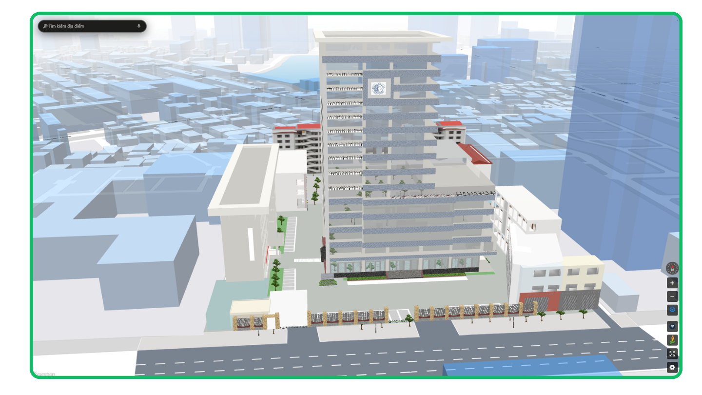 Từ đó, toàn bộ không gian được chuyển đổi từ bản vẽ 2D sang hệ tọa độ không gian 3D. Mỗi phòng học, khu chức năng hay hành lang đều được gắn với một vị trí cụ thể trên bản đồ.