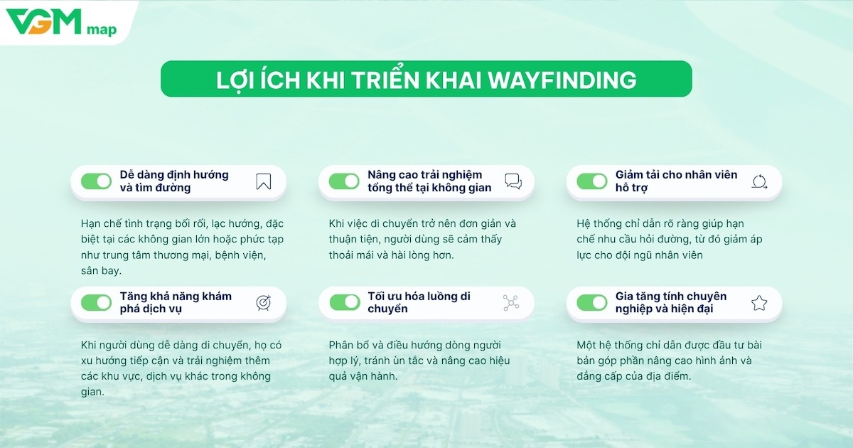 Trong tất cả các không gian trên, wayfinding giúp tiết kiệm thời gian di chuyển, giảm căng thẳng, tăng sự thuận tiện,... từ đó góp phần nâng cao trải nghiệm tổng thể của người dùng.